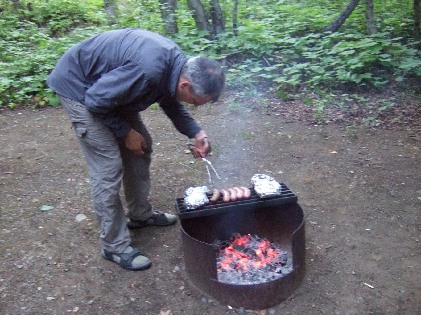 Am Abend braten wir Steaks und Würste über dem Feuer, wobei es der Chefgrilleur mal wieder schafft, den ganzen Grillrost mit Inhalt ins Feuer zu befördern. Er lernt es einfach nie.