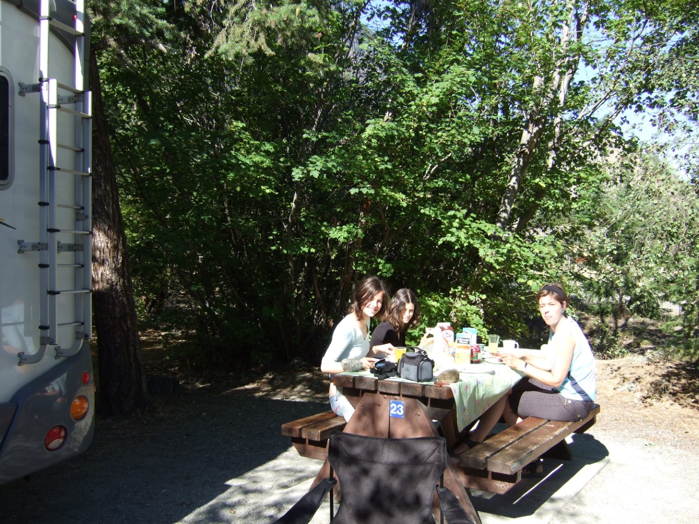 Auf dem schön gelegenen Seton Dam Campground fanden wir noch einen hübschen Stellplatz. Die Mädchen machten ein perfektes Feuer, auf dem wir die feinen Bisonburger brieten.