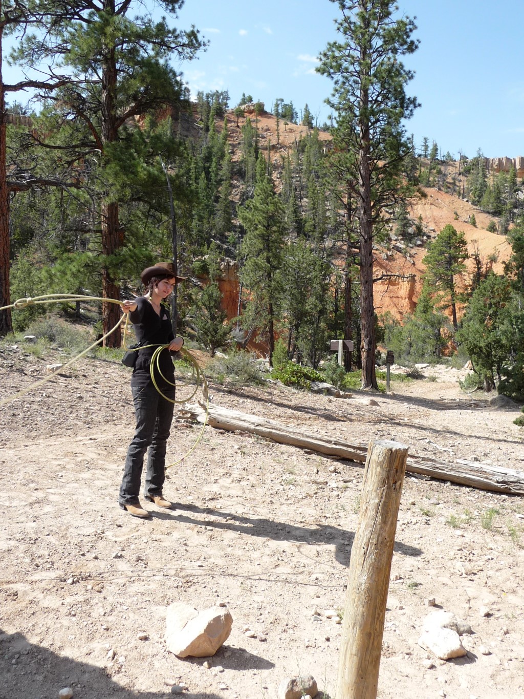 Daniela war froh, wieder auf festem Boden zu stehen. Während der Pause, übten wir Lassos zu werfen. Ich habe nach 6 erfolglosen Versuchen und zweimaligem Crash mit dem Cowboy sogar aus 3 Metern den Pfosten getroffen. Ursli hatte mit dem Lasso ein Linkshändlerproblem und Ladina und Daniela waren zu ängstlich, um das Lasso nur in die Hand zu nehmen.