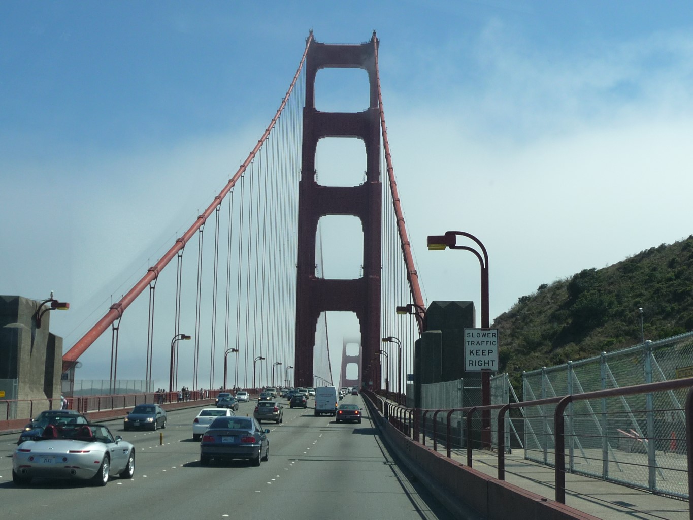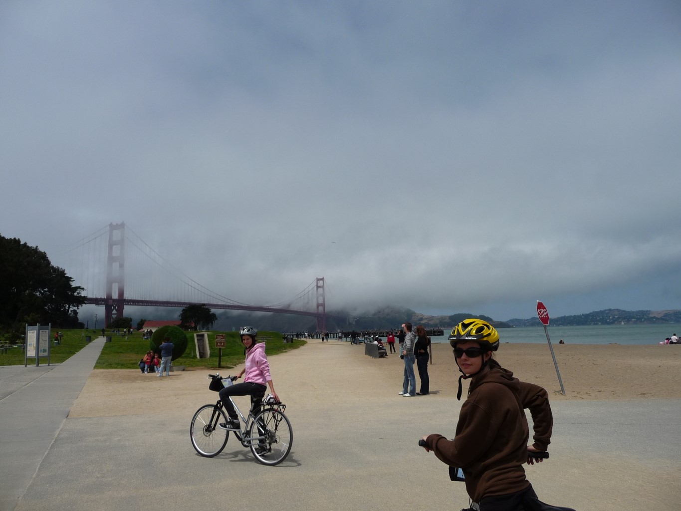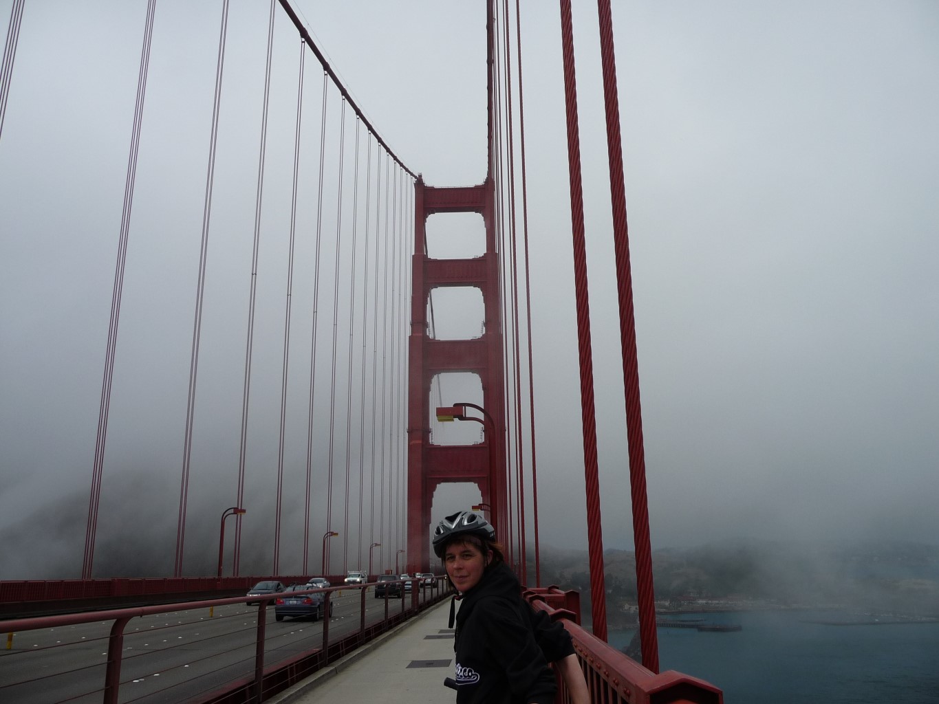 Bei Blazzing Saddles mieteten wir Bikes. Auf der Fahrt zur Golden Gate Bridge hatten wir mit Gegenwind zu kämpfen und auf der Brücke angekommen, mussten wir die 2 Meter breite Fahrspur mit hunderten von Fußgängern und Bikes teilen. Die Fahrt über die Brücke war deshalb nicht wirklich ein Vergnügen. Stellenweise hatte es dichte Nebelbänke gleich oberhalb der Fahrspur und dazu wehte ein kalter Wind.