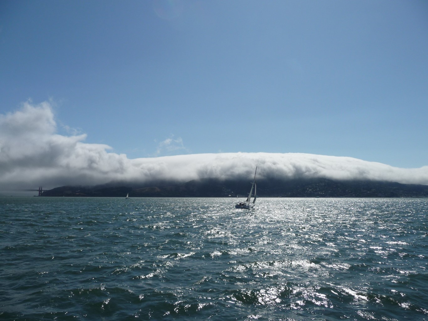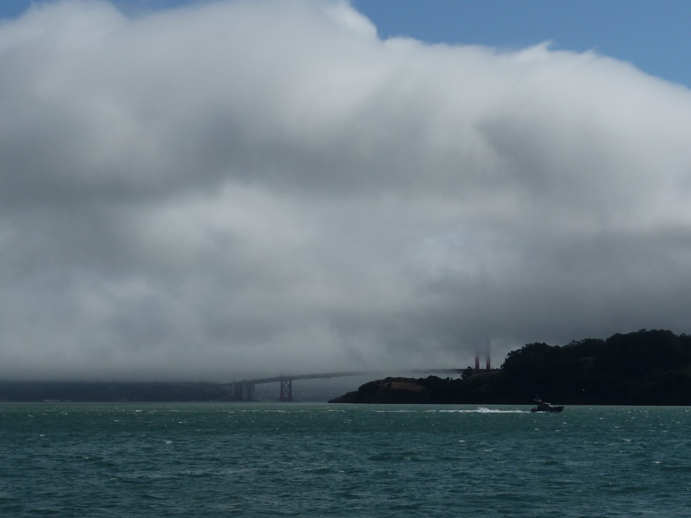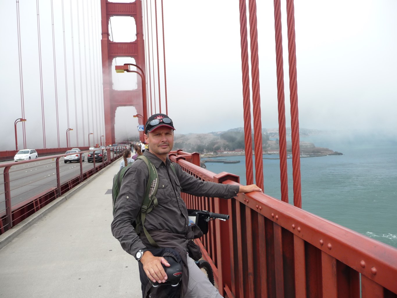 Bei Blazzing Saddles mieteten wir Bikes. Auf der Fahrt zur Golden Gate Bridge hatten wir mit Gegenwind zu kämpfen und auf der Brücke angekommen, mussten wir die 2 Meter breite Fahrspur mit hunderten von Fußgängern und Bikes teilen. Die Fahrt über die Brücke war deshalb nicht wirklich ein Vergnügen. Stellenweise hatte es dichte Nebelbänke gleich oberhalb der Fahrspur und dazu wehte ein kalter Wind.