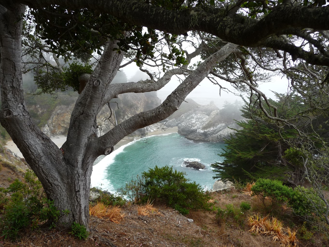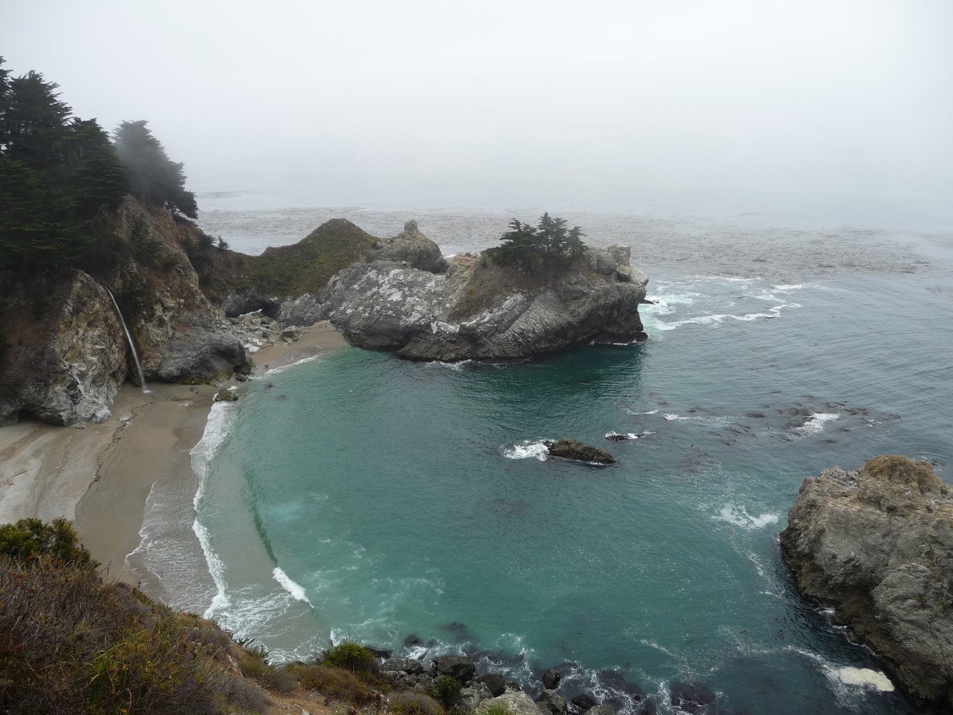 Im Julia Pfeiffer Burns State Park machen wir den ersten Halt. Gemäß Infotafel wären eigentlich 10$ Eintrittsgebühren fällig, aber da keine Registriercouverts mehr vorhanden sind, können wir uns den Betrag sparen. Der Nebel hat sich etwas gelichtet und die Aussicht auf das Mehr und den Strand mit dem kleinen Wasserfall ist hübsch.