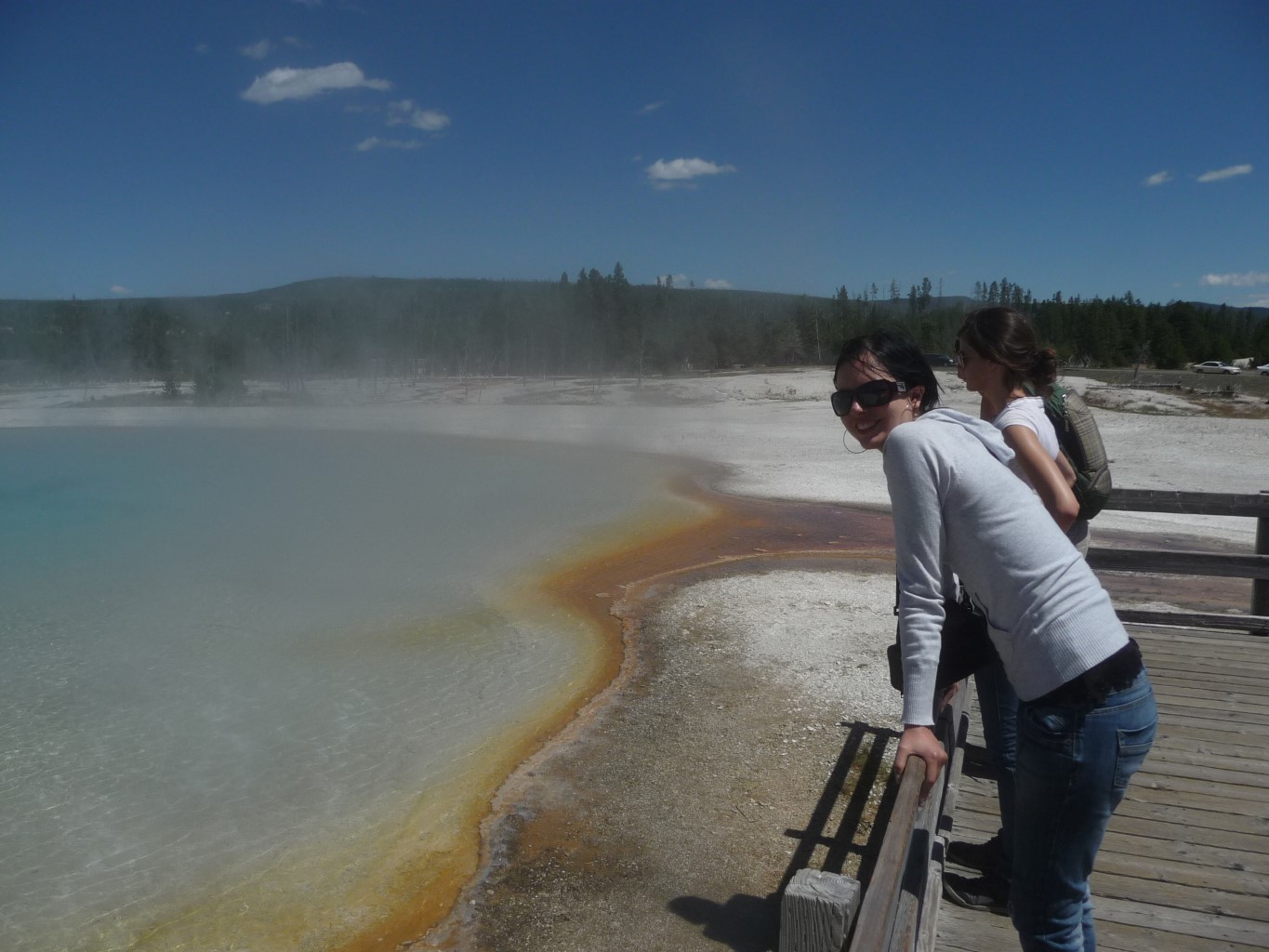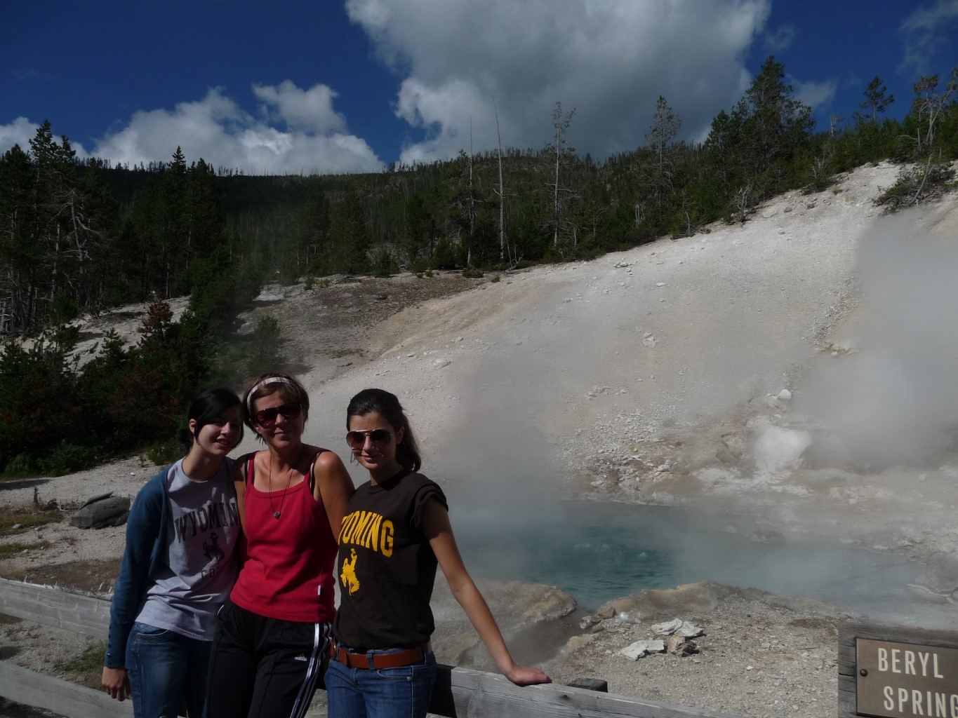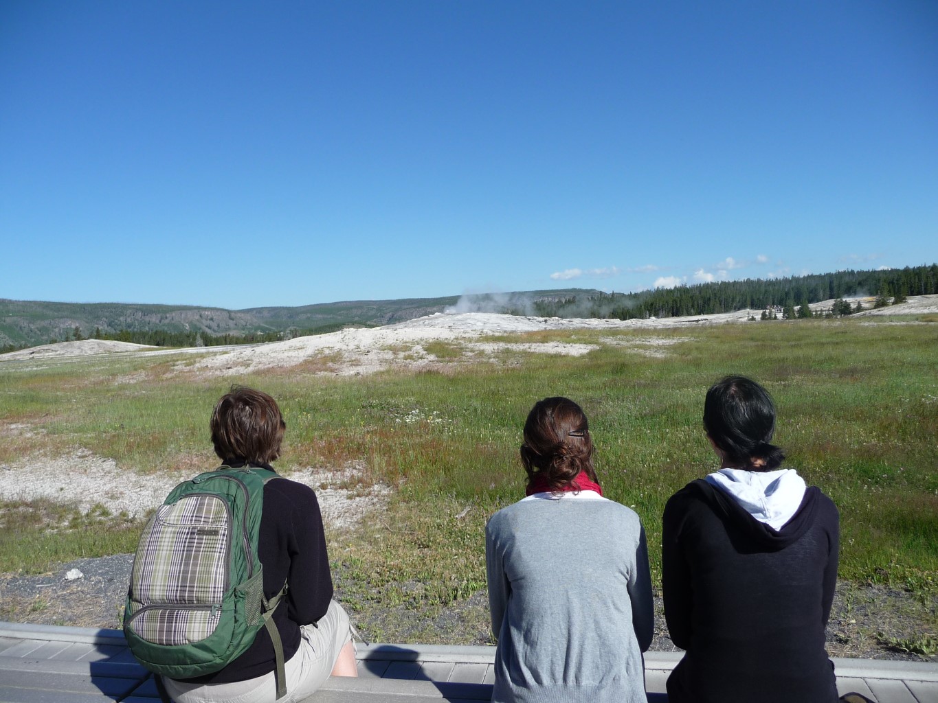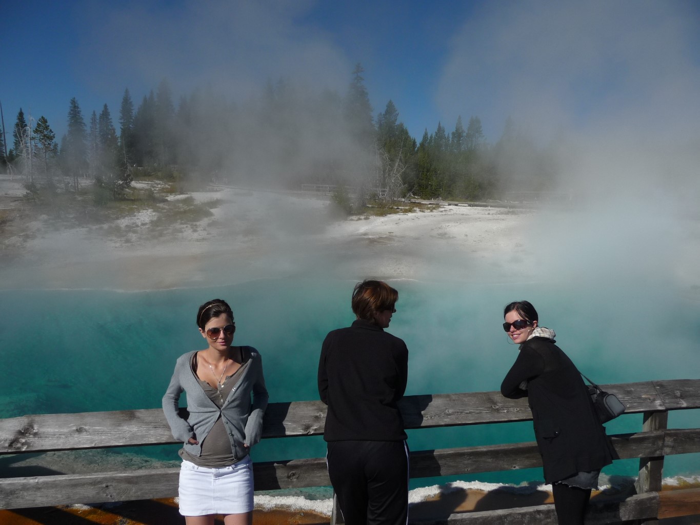Papi meinte, den perfekten Bank mit perfektem Licht für Fotos gefunden zu haben. So sassen wir dort hin. Leider hatte er die Windrichtung nicht berücksichtigt. Als der Old Faithful ausbrach, kam die Wasserwolke genau in die Richtung unserer perfekten Bankreihe. Ganz viel kaltes Schwefelwasser sprühte auf uns. Alle Leute liefen schnellstmöglich weg 🙂