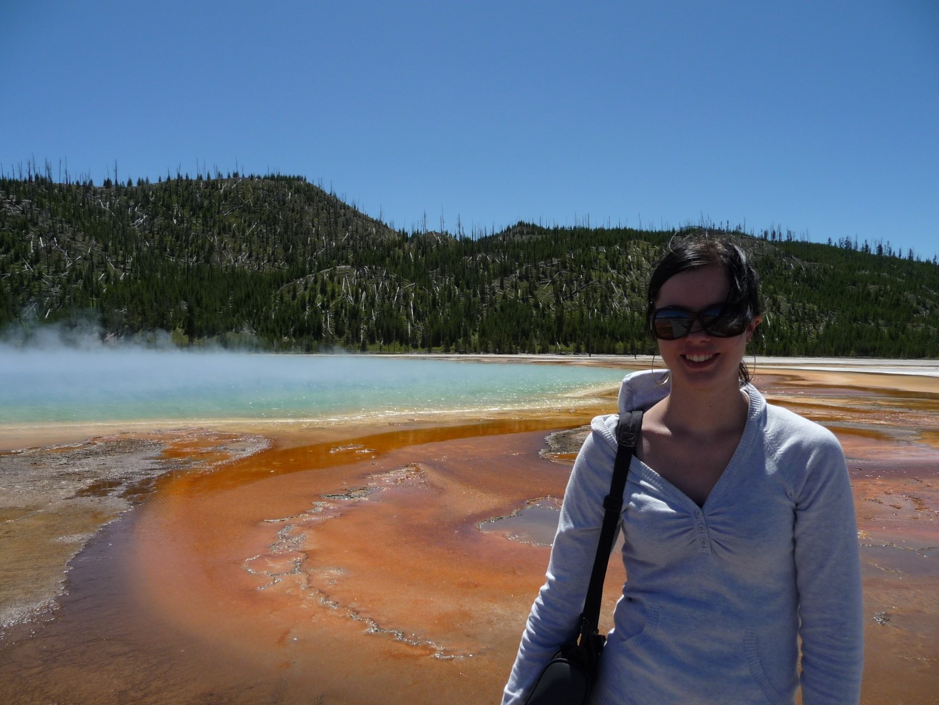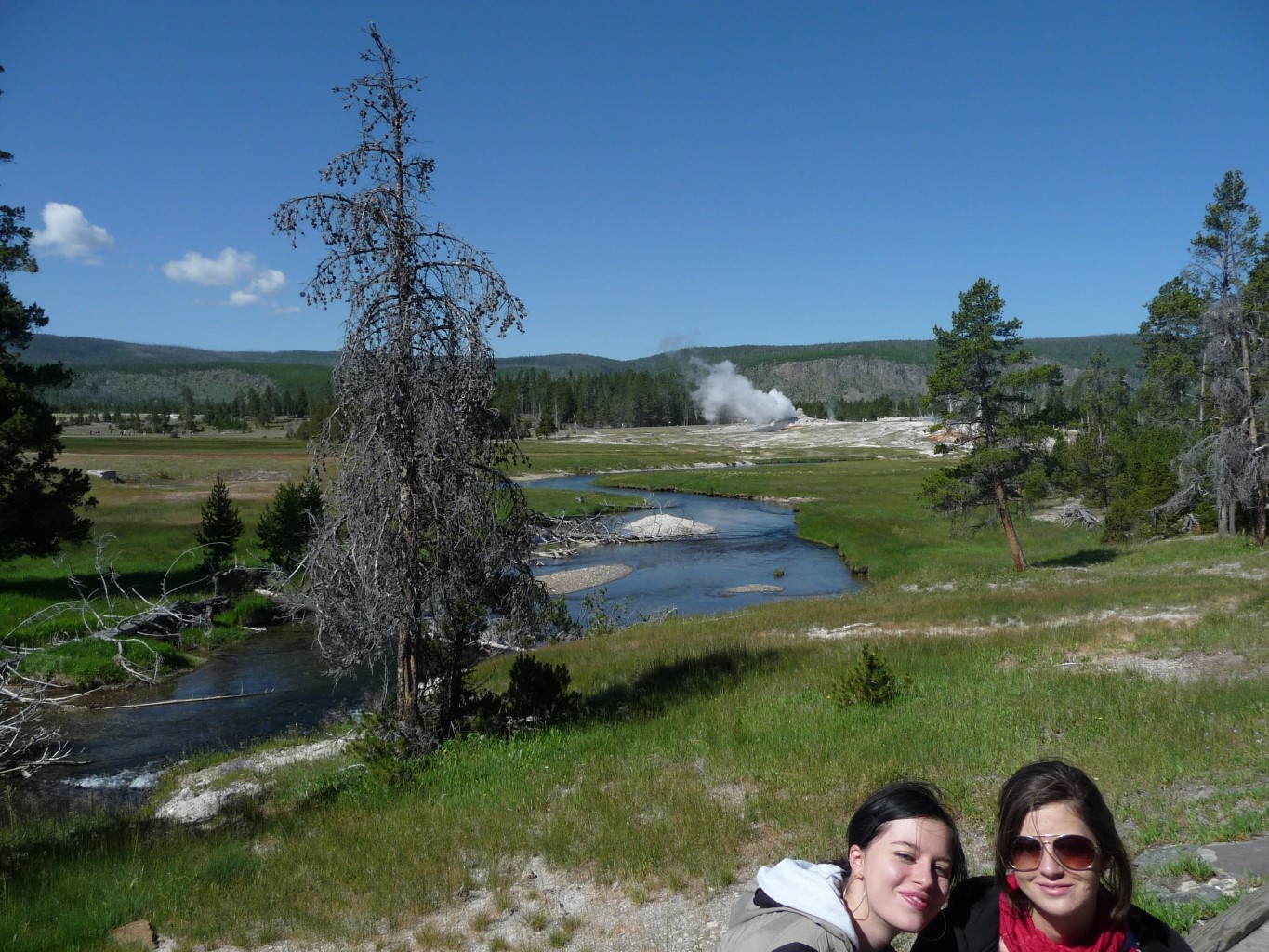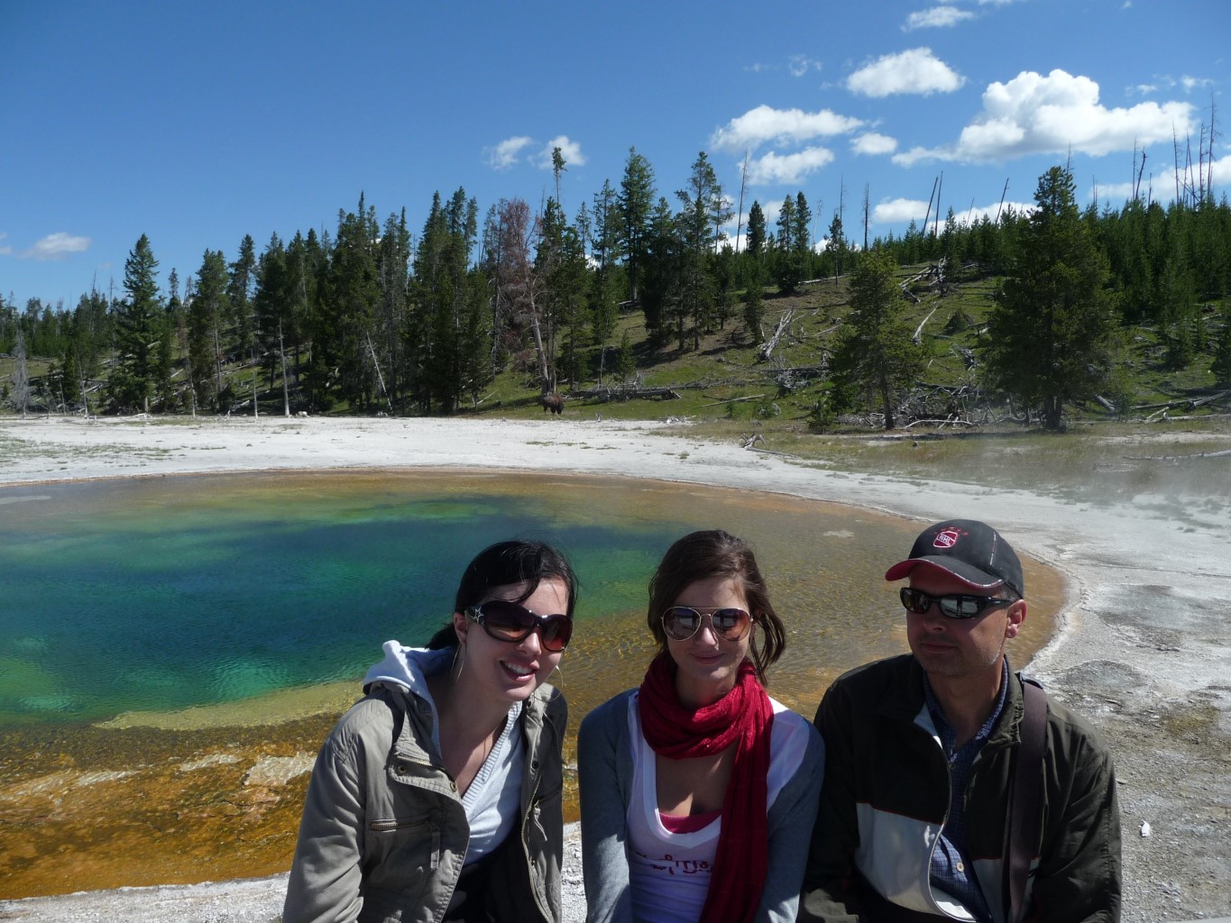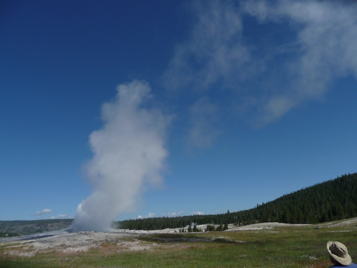 Papi meinte, den perfekten Bank mit perfektem Licht für Fotos gefunden zu haben. So sassen wir dort hin. Leider hatte er die Windrichtung nicht berücksichtigt. Als der Old Faithful ausbrach, kam die Wasserwolke genau in die Richtung unserer perfekten Bankreihe. Ganz viel kaltes Schwefelwasser sprühte auf uns. Alle Leute liefen schnellstmöglich weg 🙂