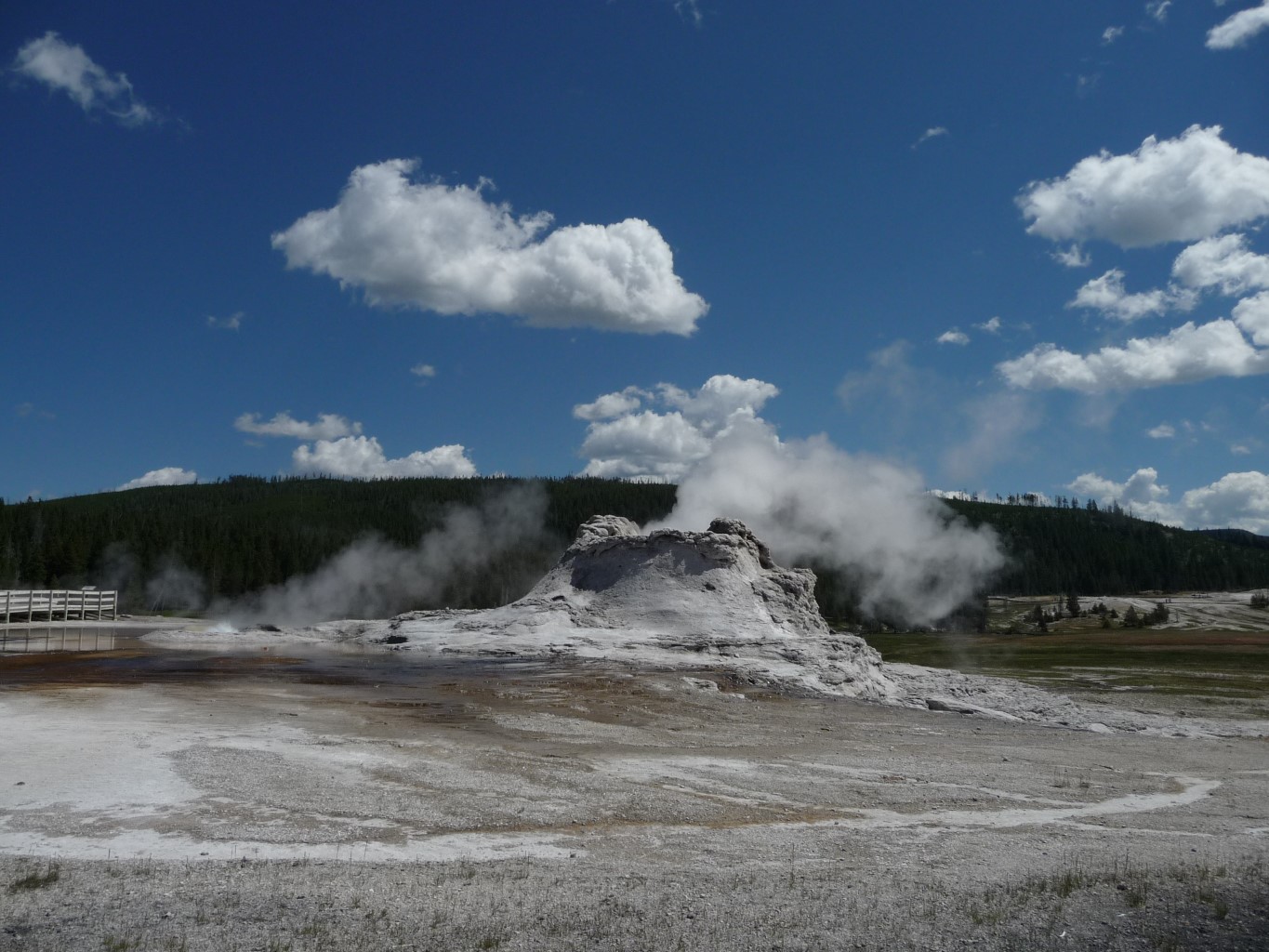 Um 9 Uhr kamen wir bei unserem ersten Ziel, dem „Old Faithful“ Geyser an. Rund um ihn waren Bänke aufgestellt, denn zum Teil sind dort lange Wartezeiten angesagt. Der Geyser bricht nämlich nur alle 76 Minuten aus. Wir hatten Glück und mussten nur eine halbe Stunde warten.