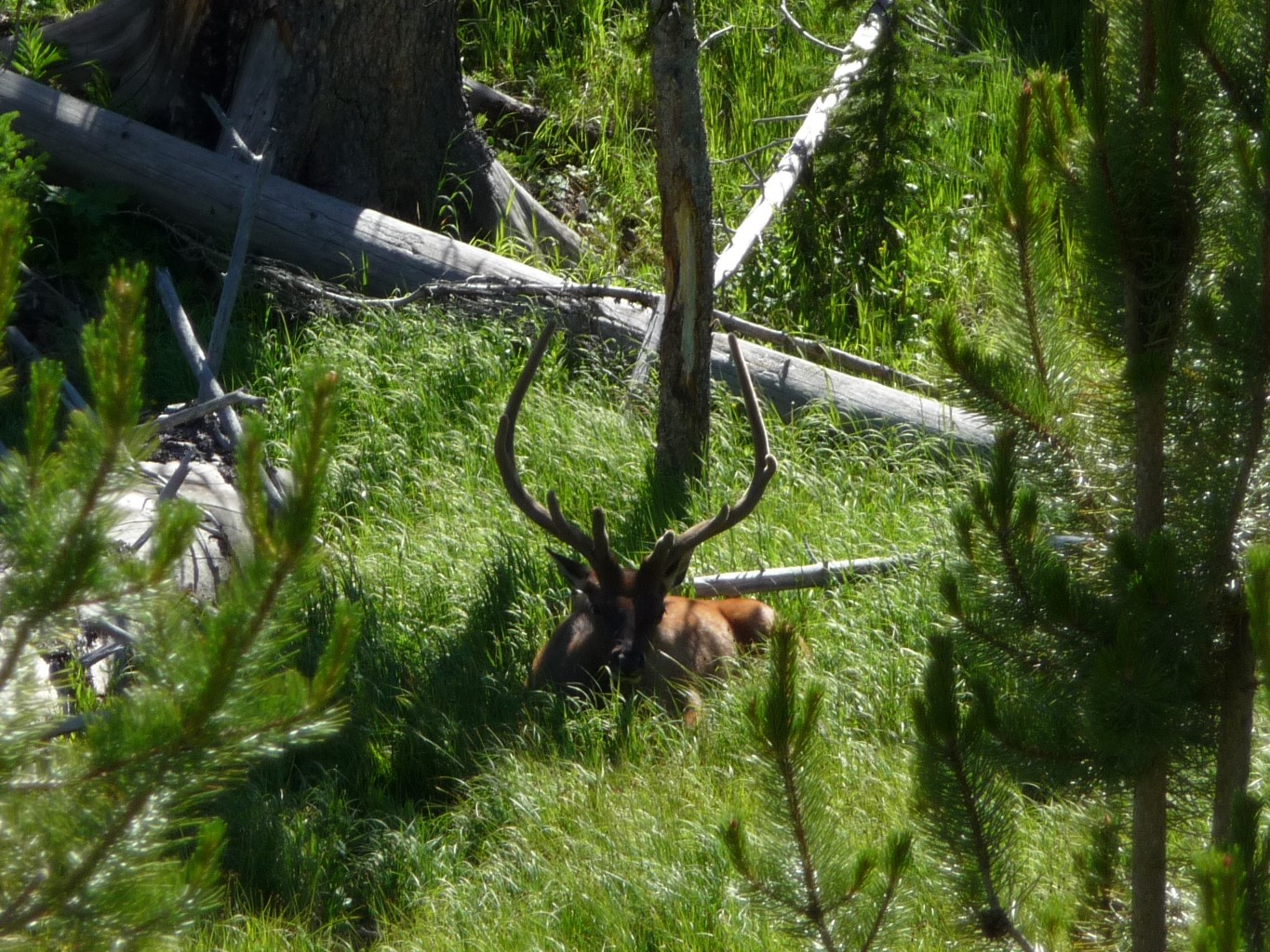 Auf einmal standen auf der Strasse ganz viele Autos und Leute, die wie wild mit ihren Fotoapparaten herum hetzten. So machten wir einen Halt um zu sehen, was dort wohl sein könnte. Mit grosser Enttäuschung stellten wir fest, dass es „nur“ ein Wapiti Hirsch war und nicht ein Bär oder Elch.