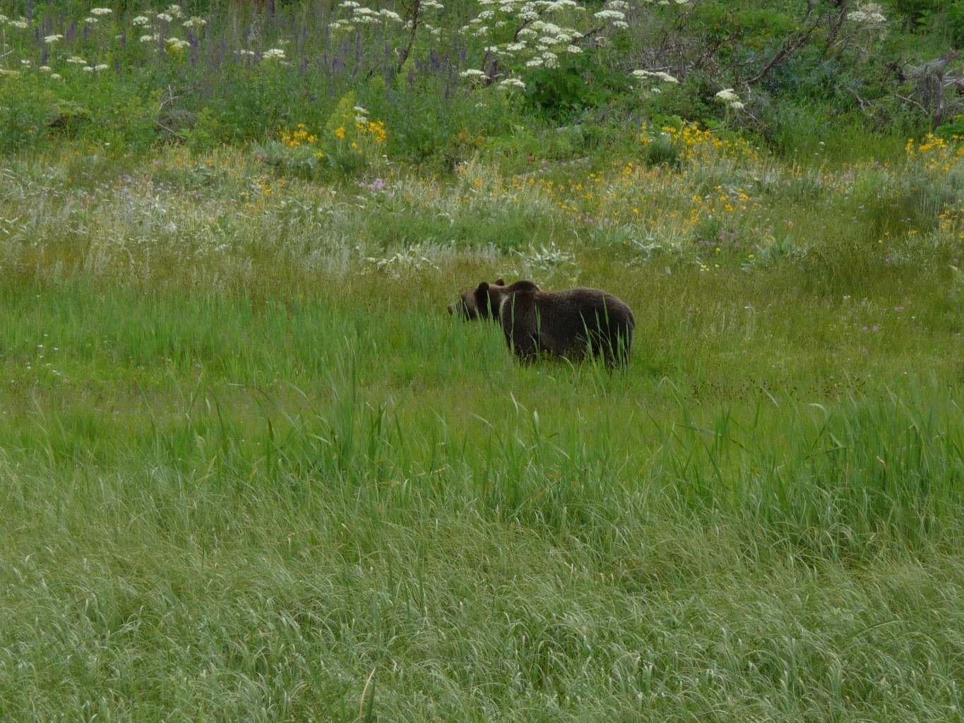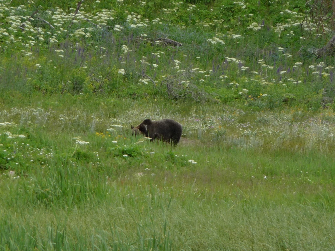 Kurz vor Fishing Bridge gab es einen riesen Tumult am Strassenrand. Autos standen kreuz und quer. Der Grund war schnell sichtbar: Ein junger Grizzlybär wühlte seelenruhig im Gras nach Essbarem und liess sich von den vielen Leuten überhaupt nicht stören.