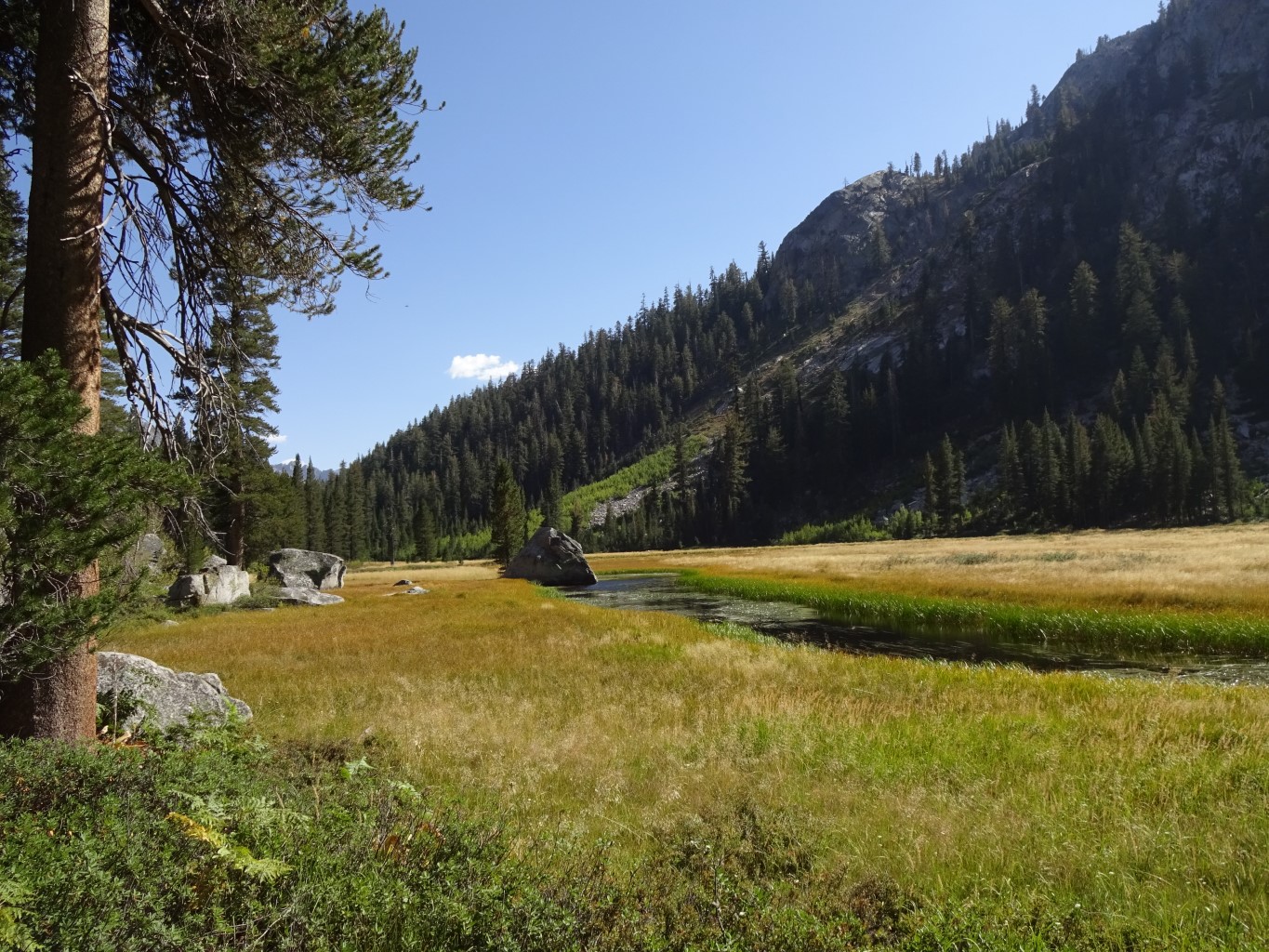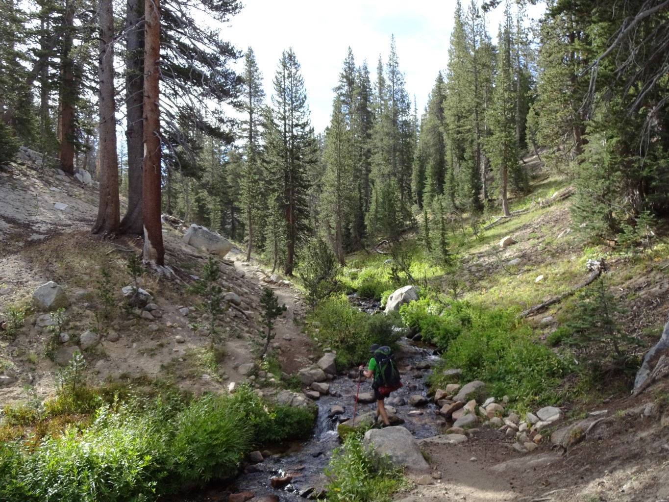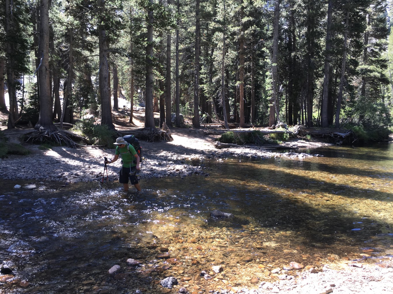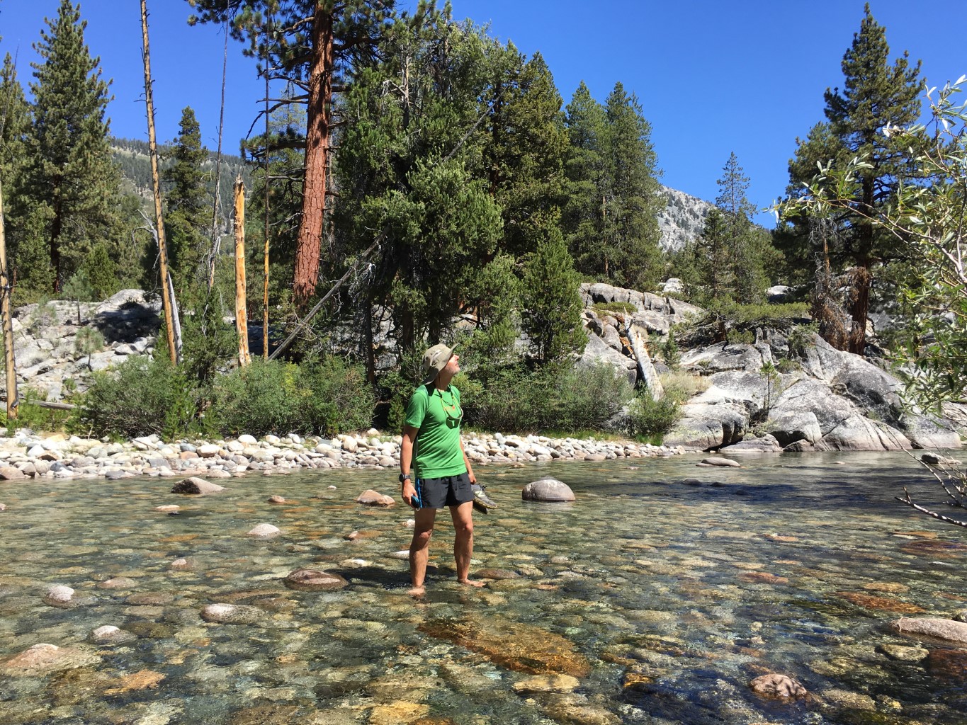 Die Route führte von der MTR hinauf ins schöne Evolution Valley. Für die Durchquerung des Evolution Creek haben wir das erste Mal auf diesem Trekking die Schuhe ausgezogen, das Wasser reichte bis zu den Knien.