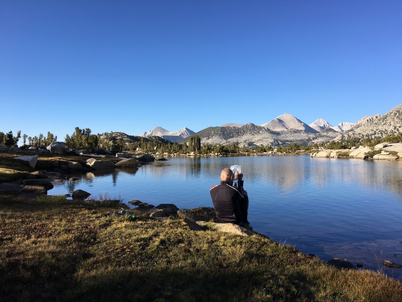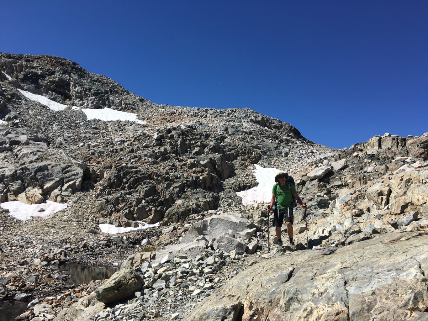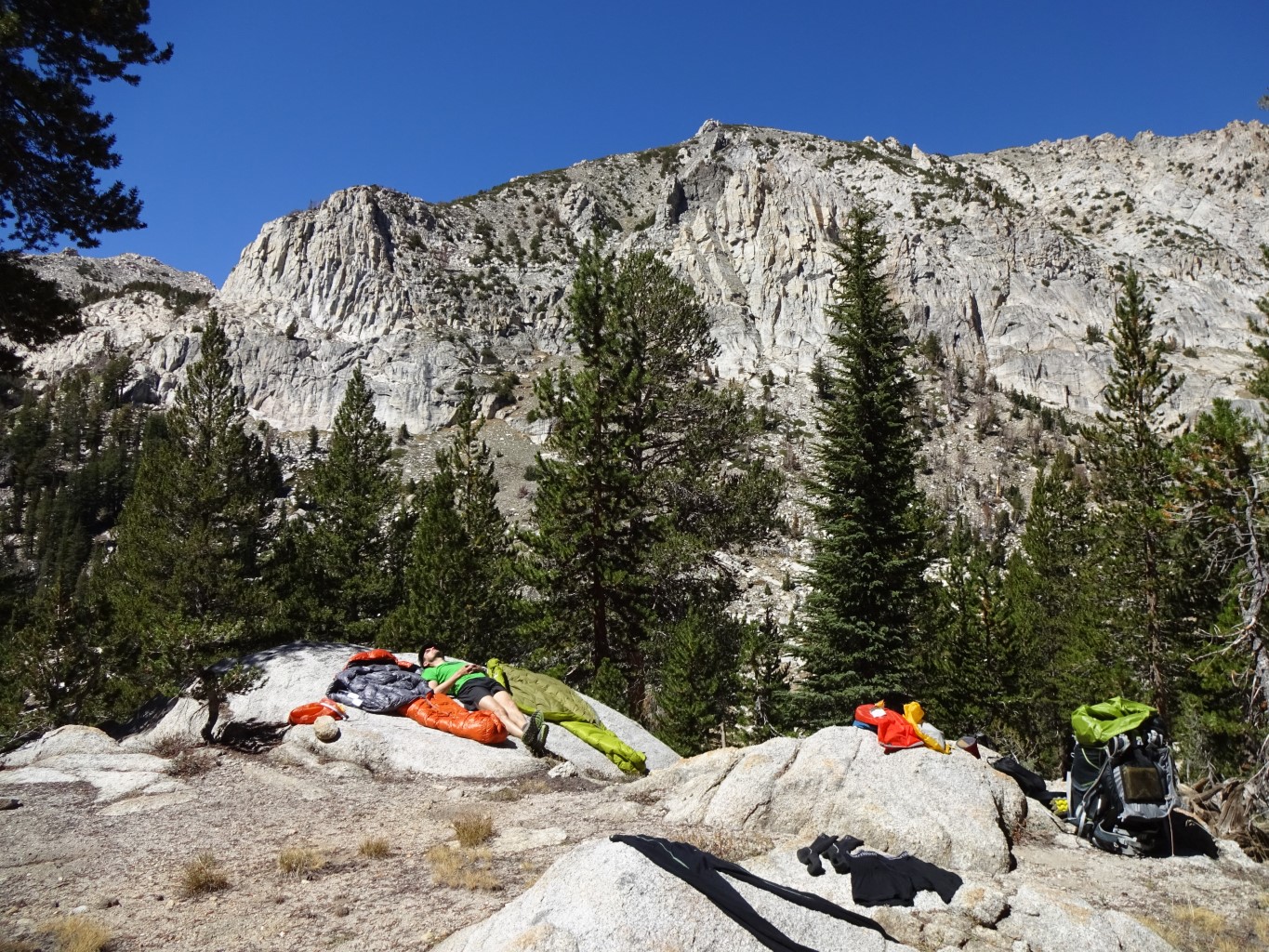 Nach einem kurzen Kaffee haben wir alles zusammengepackt uns sind über den Selden Pass marschiert. Hinter dem Pass haben wir etwas oberhalb der Sallie Keyes Lakes eine Frühstückspause gemacht und die feuchten Schlafsäcke an der Sonne getrocknet.