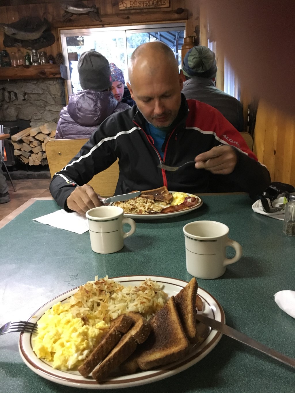 Es war eine ziemlich kalte Nacht. Wir und 20 andere Leute standen Morgens um 7 Uhr frierend vor den geschlossenen Türen des Restaurants. Wegen Ausfall des Strom Generators mussten wir uns bis halb acht gedulden, ehe der warme Kaffee serviert wurde. Das Frühstück im VVR war recht großzügig und wir assen es mit Heisshunger.
