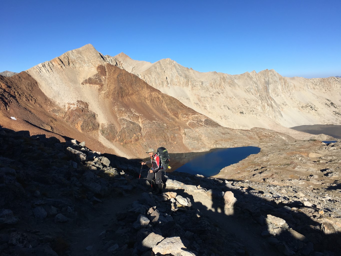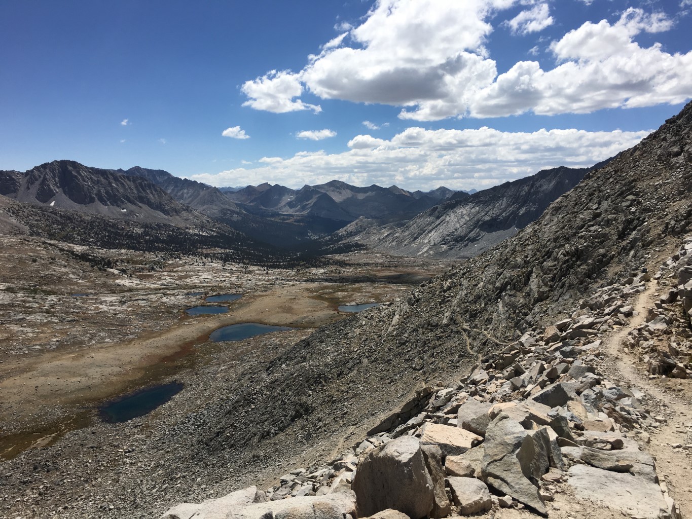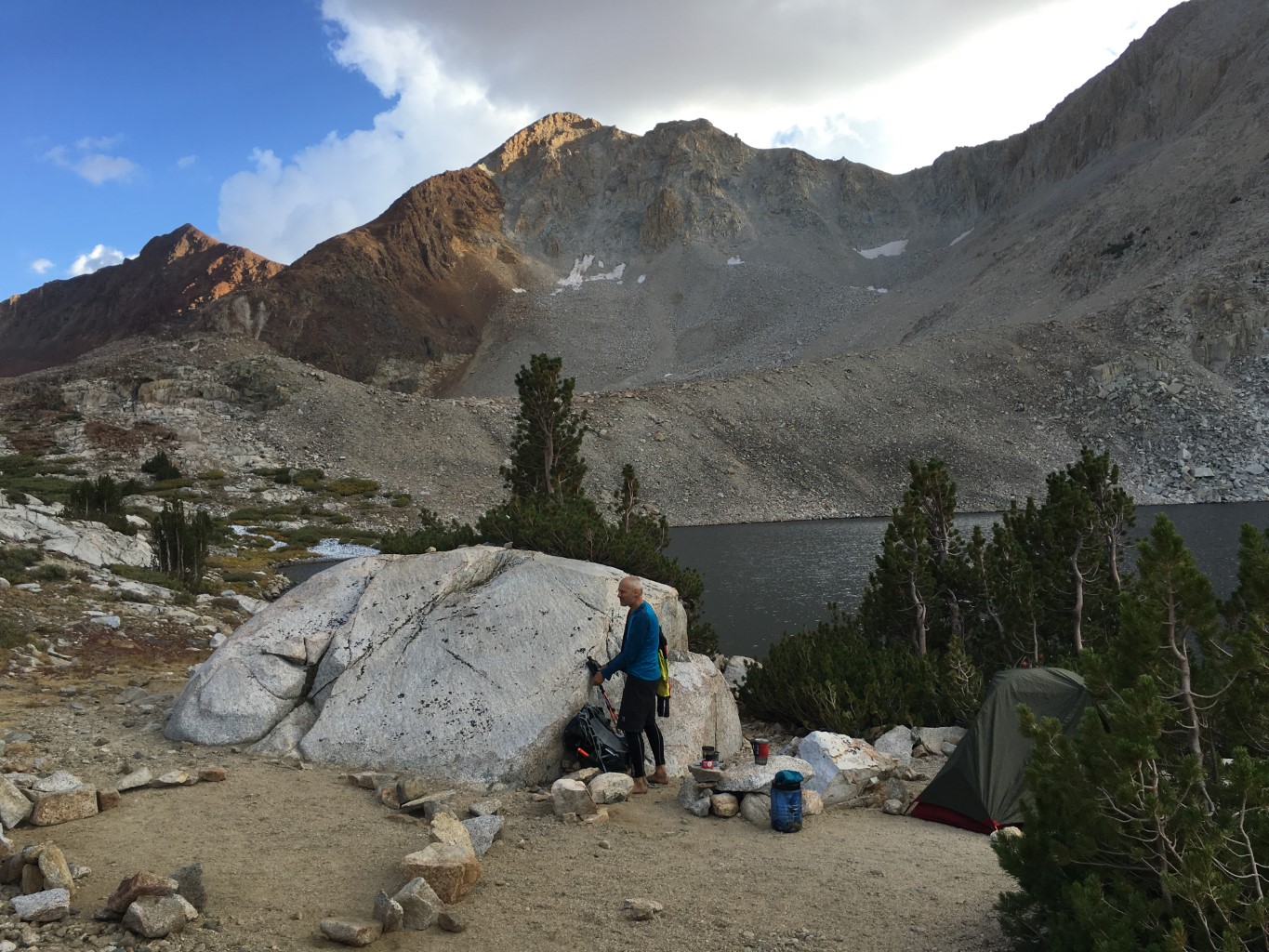 Morgens um 6 Uhr lief es wieder ab wie jeden Tag: Die Sachen zusammenpacken und Kaffee kochen. Um 7 haben wir den Aufstieg zum 3697 m hohen Pinchot Pass in Angriff genommen. Gegen 8 Uhr haben wir den höchsten Punkt für den heutigen Tag erreicht 🙂 Kurz ein paar Fotos gemacht und schon begaben wir uns auf den Abstieg. Oberhalb der Twin Lakes haben wir eine Frühstückspause eingelegt.