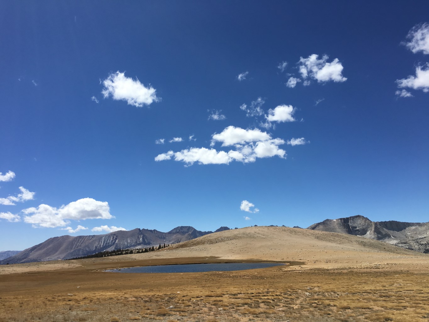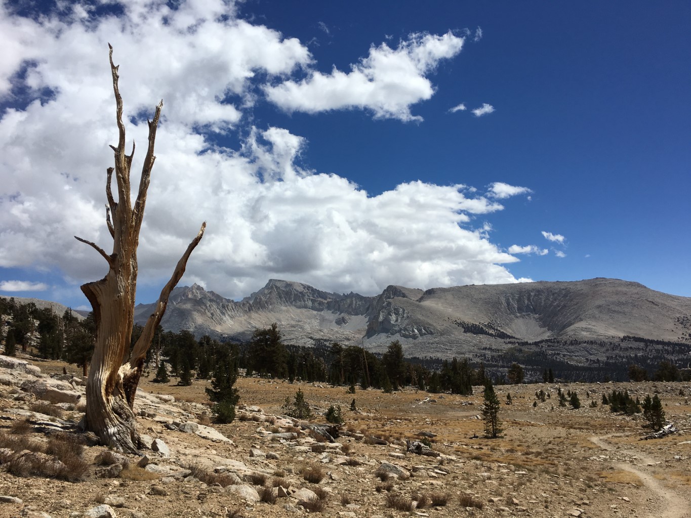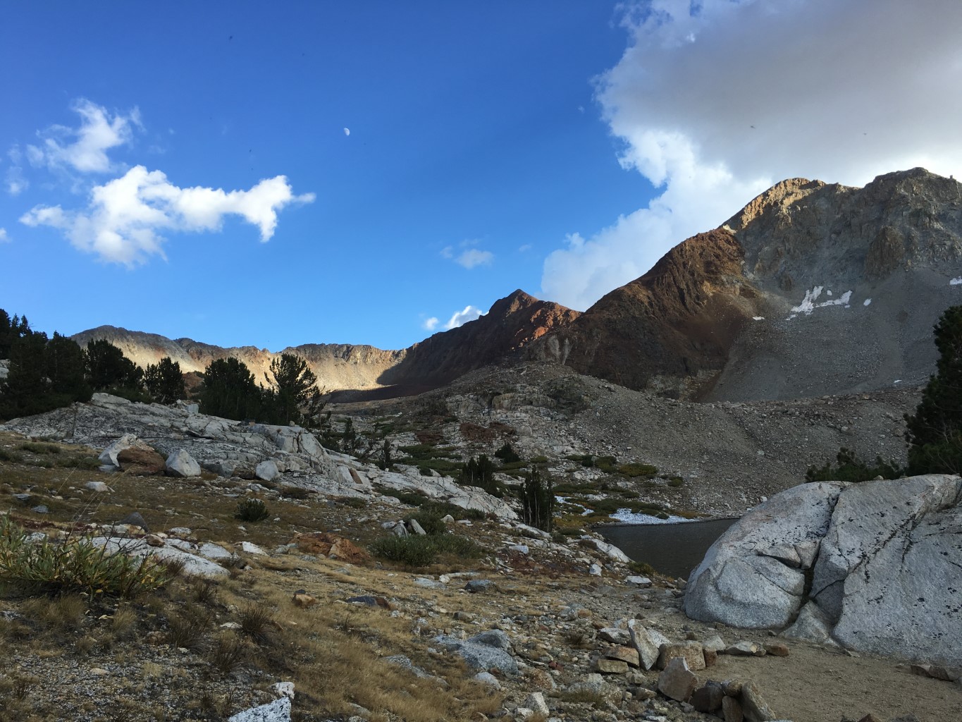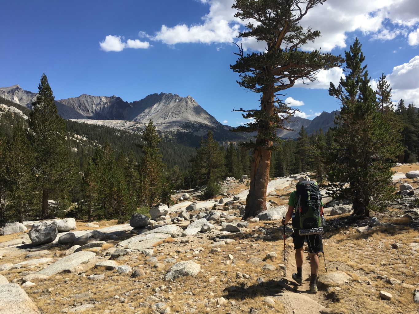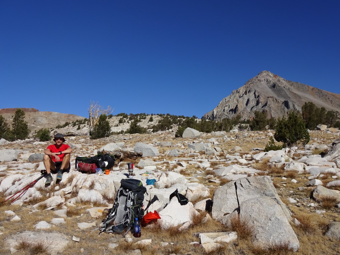 Dann ging’s hinunter über eine schöne Hochebene Richtung Crabtree Meadows. Um 11 Uhr haben wir oberhalb Tyndall Creek Frühstücks- und gleichzeitig Mittagspause gemacht. Heute war es die längste Etappe bisher, wir wollten noch bis zum Guitar Lake kommen, den wir gegen 17 Uhr erreicht haben.