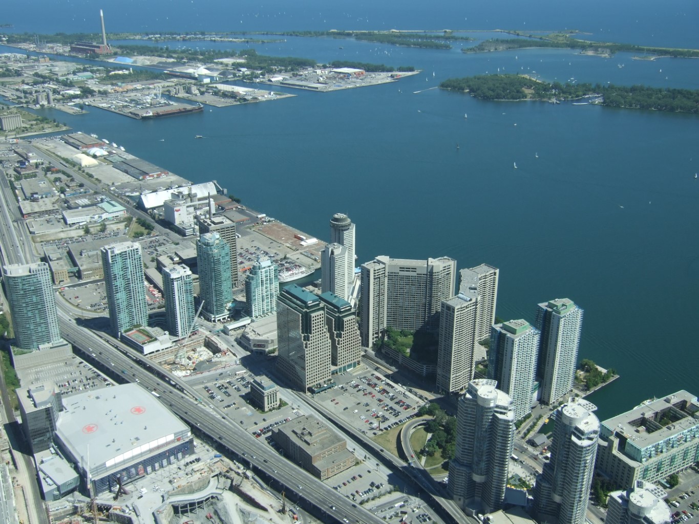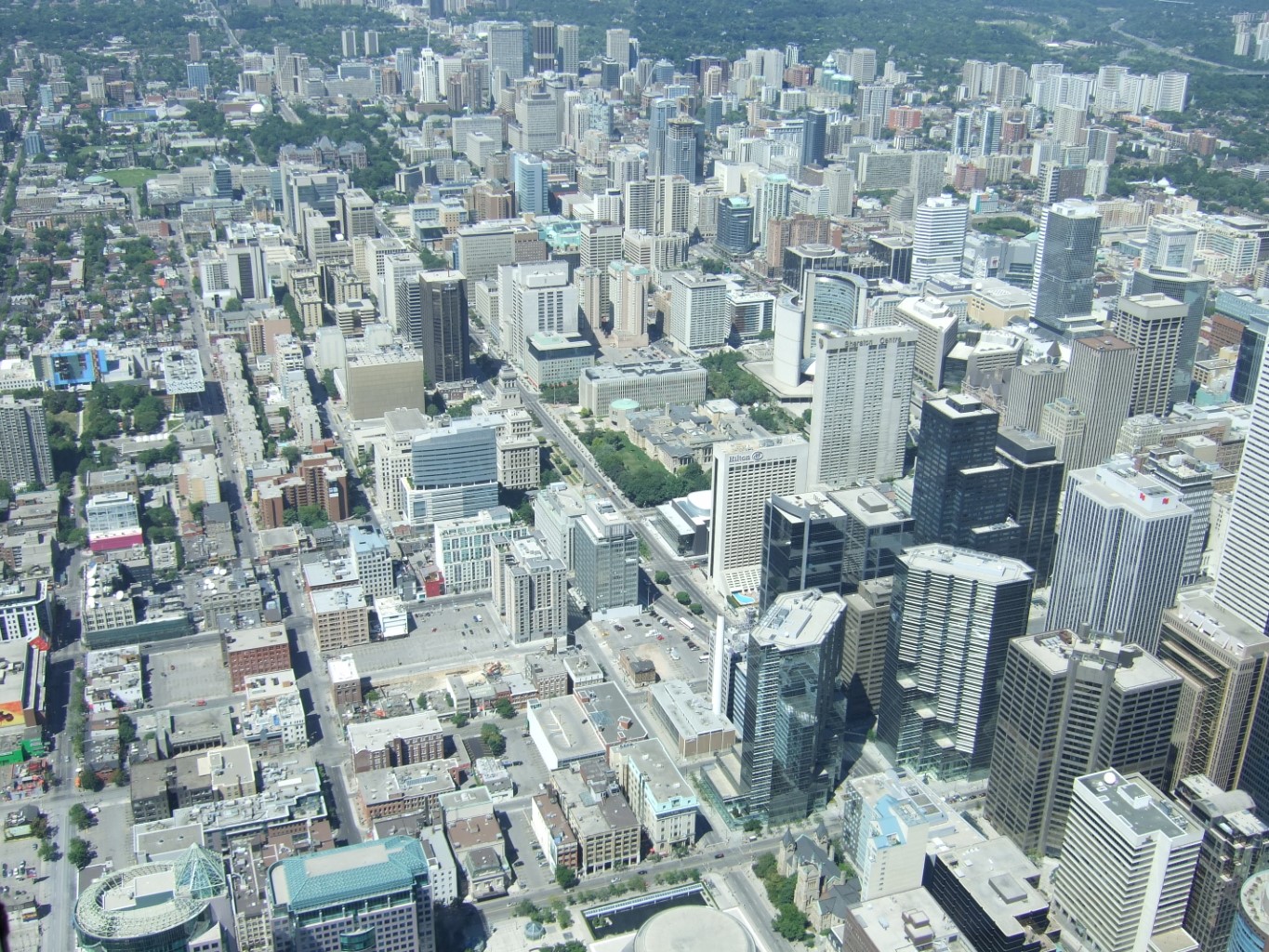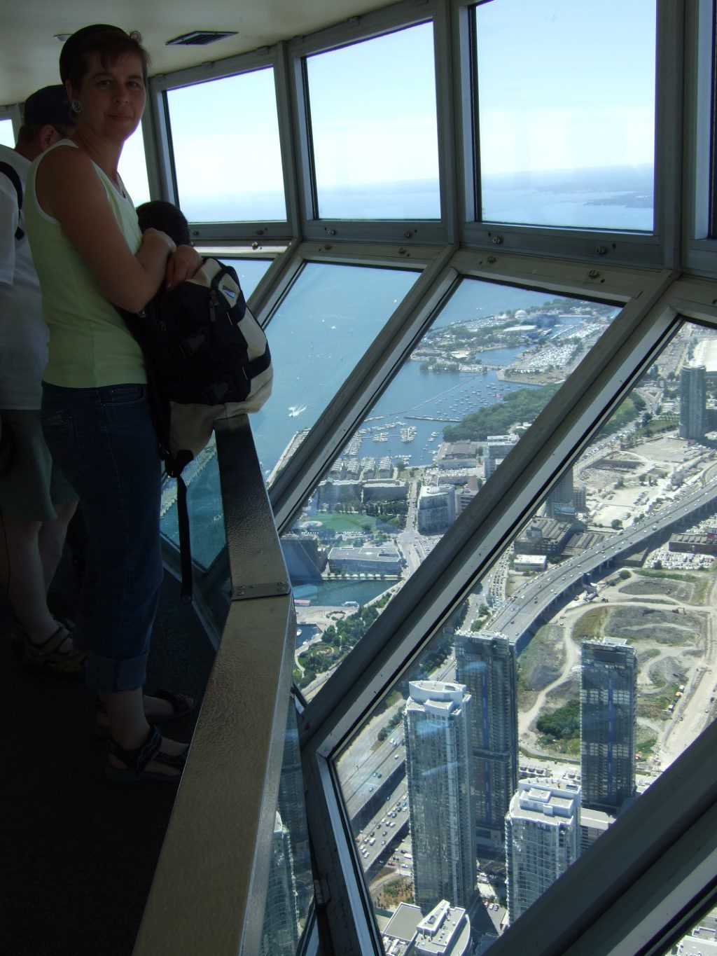 Kaum aus dem Hotel gekommen, lösten wir eine Tageskarte für die Metro, mit der wir zum CN Tower fuhren. Vom rund 550 Meter hohen Tower war einfach alles zu sehen. Bei schönem Wetter, sieht man von dort sogar die Gischt der 100 km entfernten Niagara Fälle. Der Lift, der die Besucher hinauf transportiert, hatte eine Glaswand, durch die man beobachten konnte, in welcher Höhe man sich befindet.