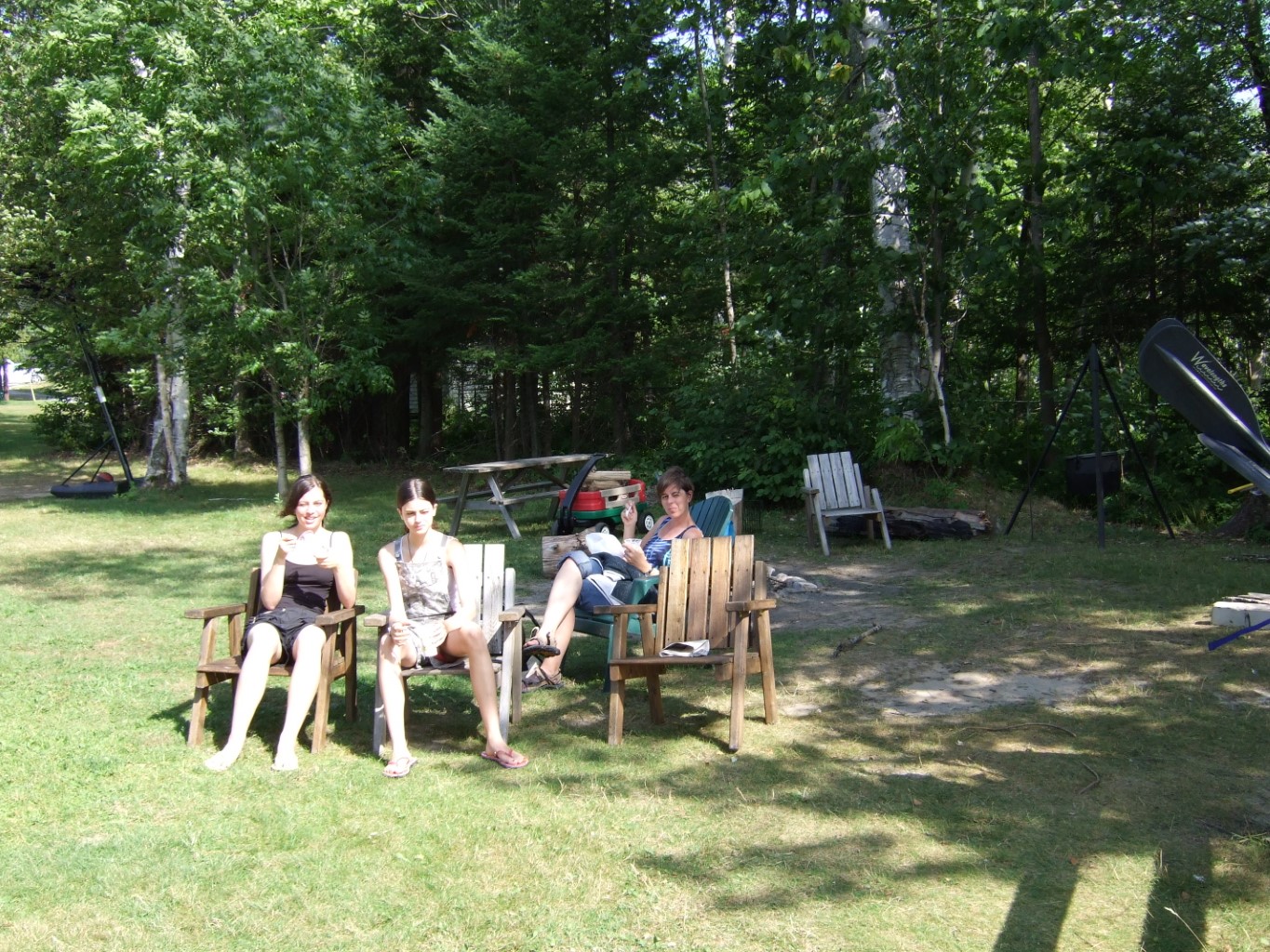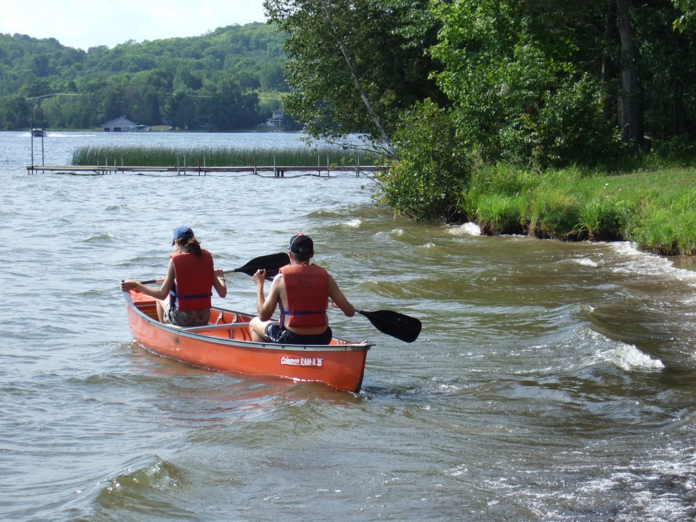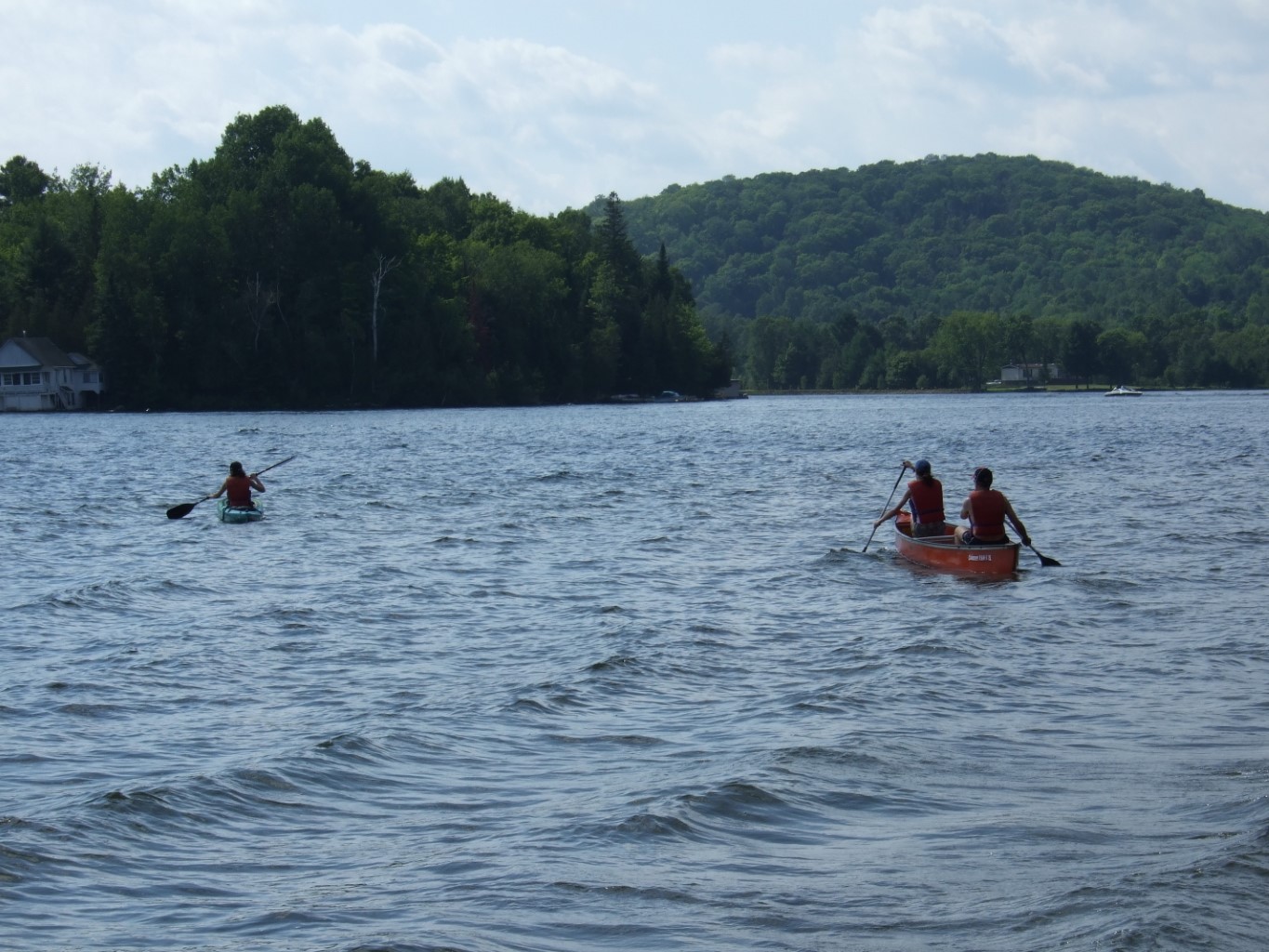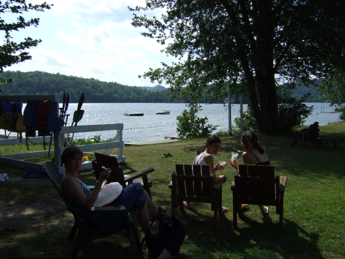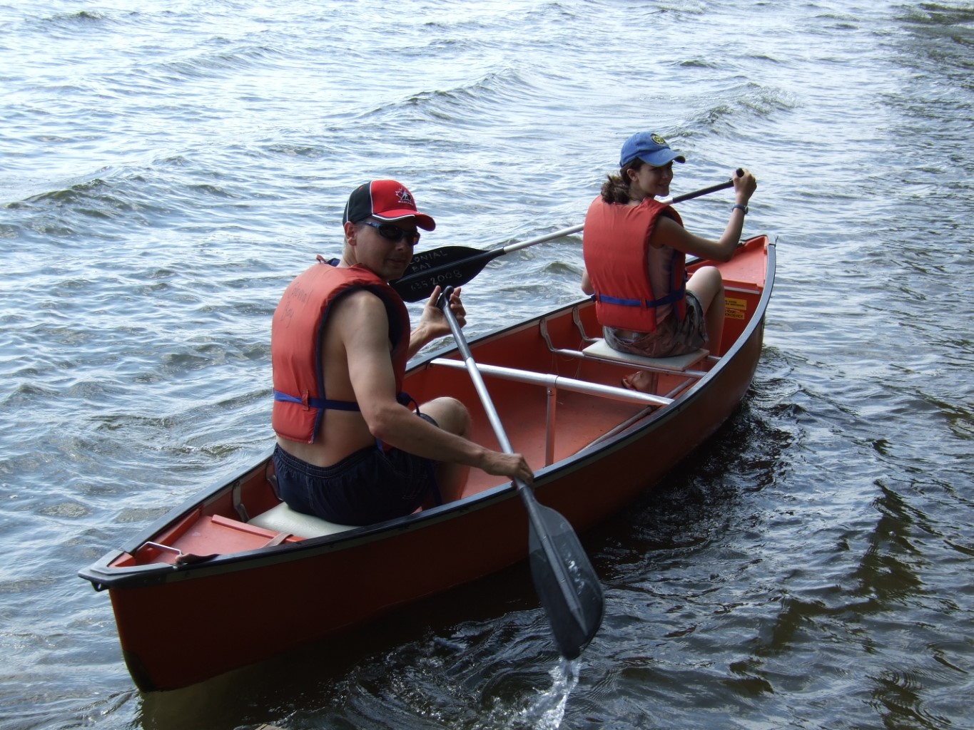 Danach fuhren Papi, Fabienne und ich mit einem Kanu und einem Kajak auf dem See herum. Wieder zurück, legten sich Papi und Mami an die Sonne, Fabienne und ich schrieben noch die letzten Karten. Um etwa 7 Uhr assen wir einen feinen Salat am Strand und genossen die Abendsonne.