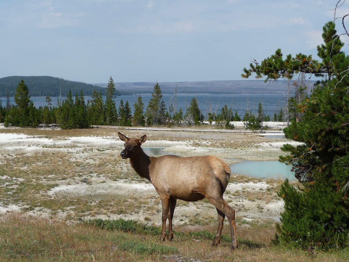 Weiter machten wir einen kurzen Abstecher Richtung Sylvan Lake. Vor zwei Jahren hatten wir da einen Grizzly Bären gesehen. Trotz intensiver Suche mit dem Feldstecher konnten wir aber diesmal keinen Bären entdecken. Beim West Thumb Geyser Basin machten wir einen Rundgang, bei dem wir zwei grosse Elks aus der Nähe bestaunen konnten.