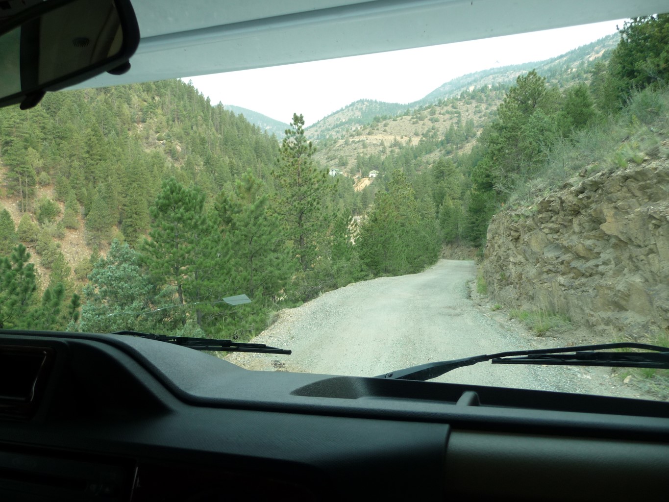 Schon kurz nach der Abfahrt führte uns das Navi auf eine Schotterpiste, steil bergauf, an verlassenen Goldminen vorbei. Dann ging es in engen Serpentinen steil bergab und die Piste wurde immer enger. Uns überkam zeitweise ein mulmiges Gefühl. Bleiben wir auf der engen Piste mit unserem gut 7 Meter langen Gefährt plötzlich stecken und reicht das Benzin ?