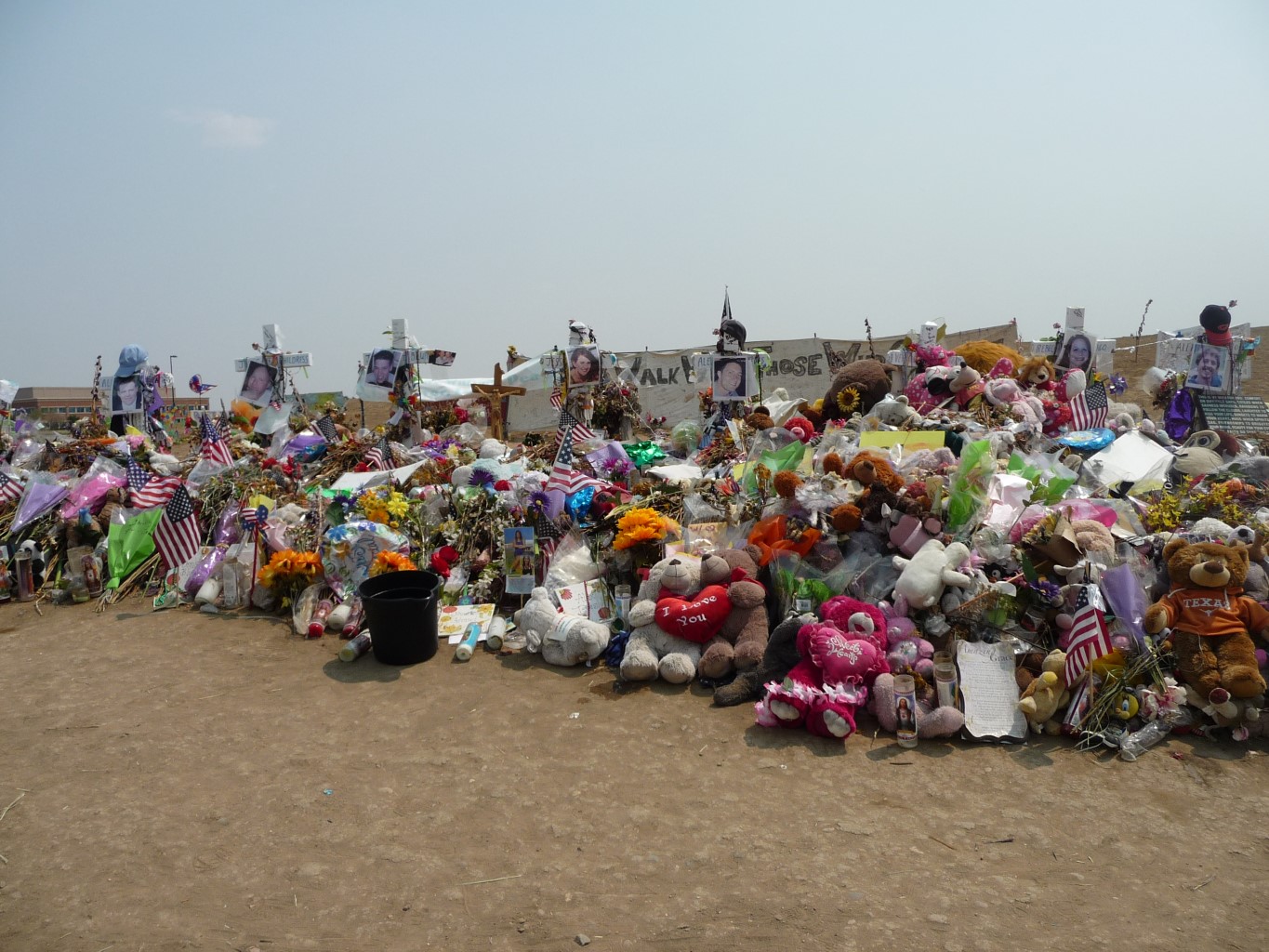 Es war das City Centre in Aurora, wo vor 4 Wochen im zugehörigen Kino das „Batman Massaker“ mit 12 Toten und 58 zum Teil schwer Verletzten stattgefunden hatte. Das Kino war noch komplett abgesperrt und daneben gab es eine Wiese mit tausenden Abschiedbriefen, Blumen, Plüschtieren und anderen Erinnerungen an die Opfer dieses unbegreiflichen Verbrechens.