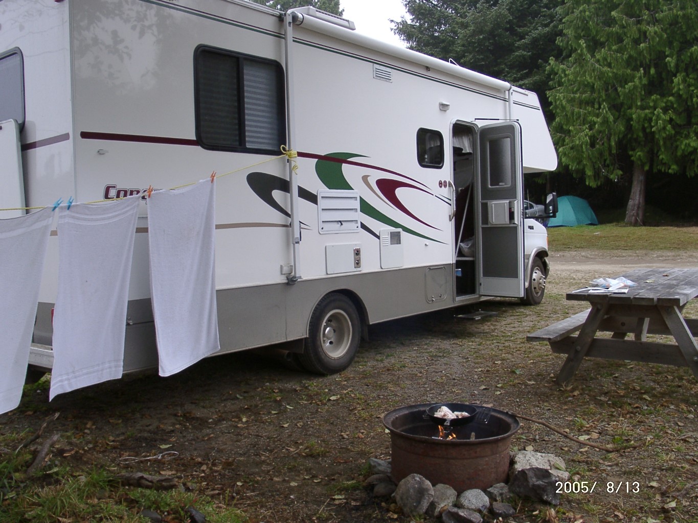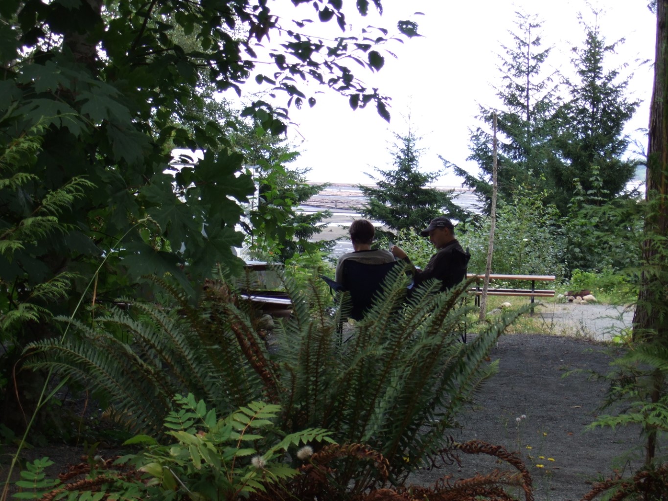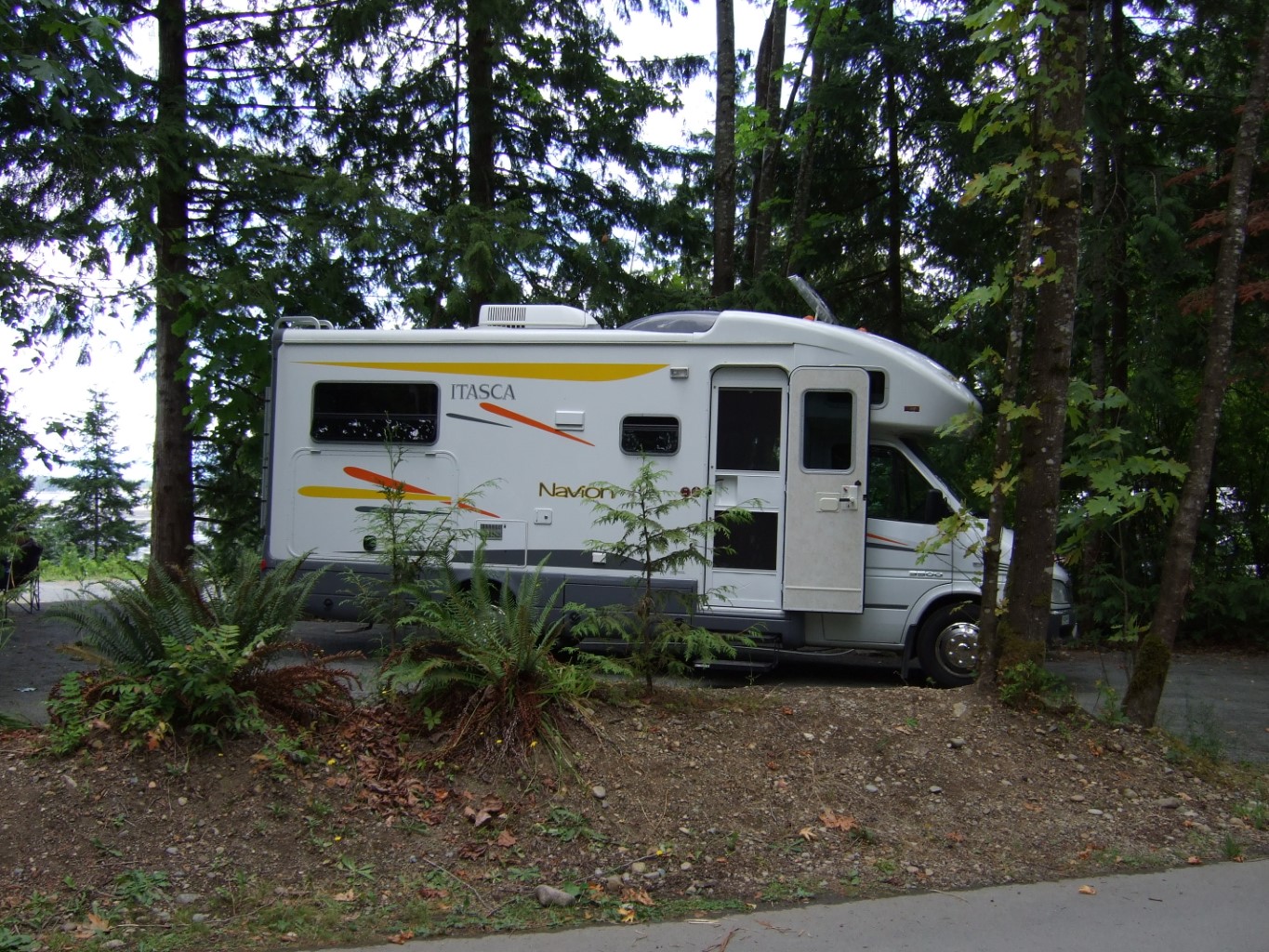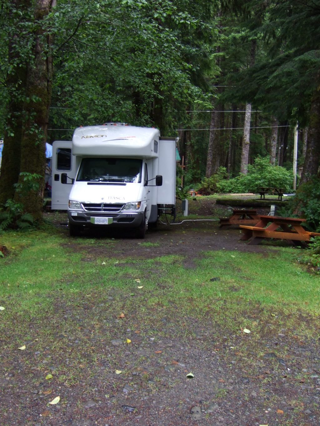 Beim Hafen checken wir für eine Nacht auf dem Telegraph Cove Resorts Campground ein. Die Reservation per Internet hat sich wie bei den vorgängigen Campingplätzen bewährt. Die Campsites selbst befinden sich ca. 500 Meter oberhalb des Hafens in einem Wald. Schnell haben wir unser Wohnmobil verkabelt und eingerichtet.