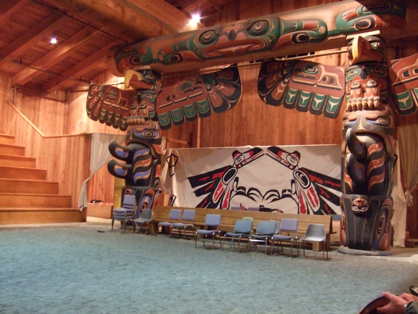 Das Gemeinschaftshaus war sehr geschmacksvoll eingerichtet. Ringsum waren Sitzbänke und in der Mitte eine Feuerstelle. Im ganzen Raum befanden sich Zeichnungen von Tieren und Totems. Am Abend sind wir zeitig ins Bett gegangen.